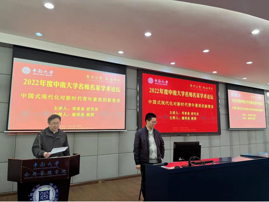 202346日下午3:30,中国青少年研究中心研究员,共青团与青年工作高端智库专家,北京青年研究会会长,中国社会学会青年社会学分会副理事长邓希泉研究员受邀在公司院楼404室,进行了主题为“中国式现代化对新时代青年素质的新要求”的中南讲堂·名师名家论坛系列讲座。公司共计百余师生聆听了此次讲座,本次讲座由公司副经理潘泽泉教授主持。