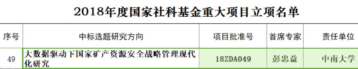 2018年11月6日,全国哲学社会科学规划办公室公布2018年度国家社科基金重大项目立项名单,公司行政管理系教授、伟德中国官网入口地方治理研究院经理彭忠益为首席专家申报的《大数据驱动下国家矿产资源安全战略管理现代化研究》获准立项。