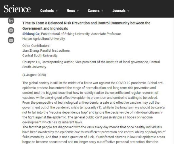 2020年8月4日,公司公共管理系胡春艳教授与2019级博士生张建、河南农业大学青年教师葛世栋博士在国际顶级自然科学期刊杂志《Science》(《科学》)eletters栏目,在线合作发表《Time to Form a Balanced Risk Prevention and Control Community between the Government and Individuals》一文。