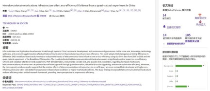 该论文将信息基础设施和生态效率纳入一个统一的研究框架,为提高生态效率提供了一个新的视角。信息化和数字化已成为中国经济发展和环境治理的突破性课题,信息基础设施的技术知识溢出和经济集聚效应可以提高生态效率。本研究采用渐进双重差分(DID)模型和事件研究方法,利用2008年至2018年的城市层面数据和宽带中国政策的准自然实验,评估信息基础设施对生态效率的影响。就其影响机制而言,信息基础设施可以通过绿色创新、产业结构升级和资源配置效率促进生态效率提高。研究的异质性分析结果表明,在经济发达城市、生态效率较高城市以及交通基础设施条件较好或市场化水平较高的城市,信息基础设施对生态效率的积极影响更为显著。研究结果为实现经济与生态协调发展提供理论借鉴,对我国如何尽快跨越高耗能、高污染的经济发展阶段具有重要的现实意义。