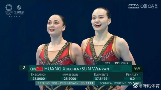 技术自选和自由自选预备赛总得分为191.7832分,位列第二。